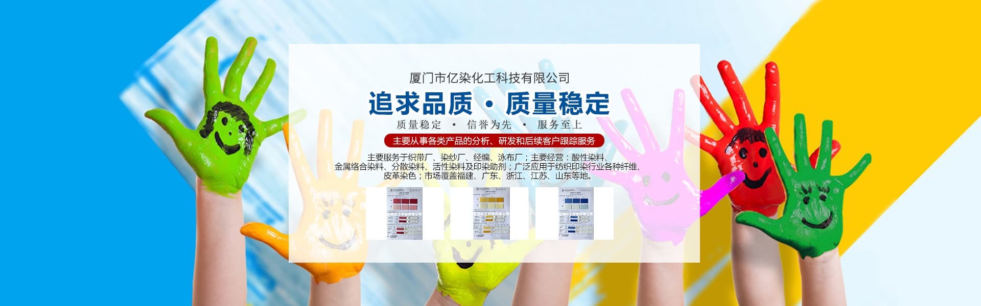 廈門市億染化工科技有限公司是一家集研發(fā)、生產(chǎn)、銷售一體的綜合型企業(yè)。公司主要經(jīng)營(yíng):酸性染料、金屬絡(luò)合染料、高牢度分散染料及印染助劑。公司信守“以誠(chéng)信贏合作、以質(zhì)量贏市場(chǎng)、以創(chuàng)新贏發(fā)展、以服務(wù)贏生存”的企業(yè)精神服務(wù)于廣大客戶,多年以來(lái)建立了良好的市場(chǎng)口碑,市場(chǎng)遍布福建、廣東、浙江、江蘇、山東及東南亞國(guó)家,與多家知名企業(yè)建立了長(zhǎng)期合作伙伴關(guān)系!
